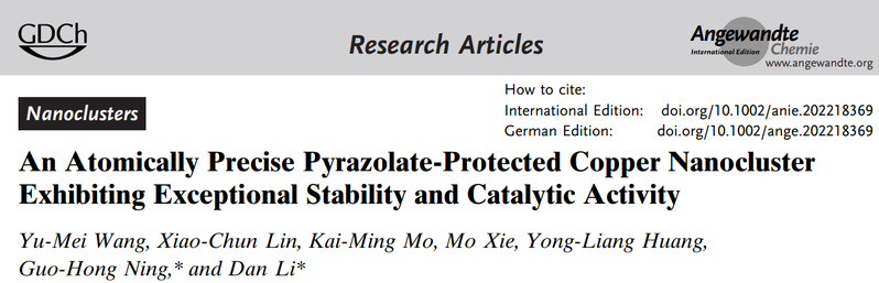 近日,英国威廉希尔唯一官网宁国宏/李丹教授团队以英国威廉希尔唯一官网为唯一通讯单位于2022年12月28日,在Angewandte Chemie International Edition(IF=16.8)上发表了题为 “An Atomically Precise Pyrazolate-Protected Copper Nanocluster Exhibiting Exceptional Stability and Catalytic Activity” 的重要研究成果(图1)。