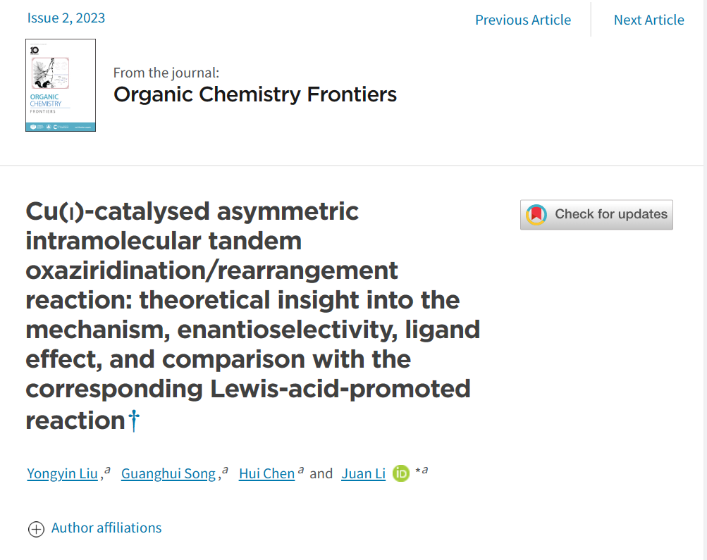 近日,英国威廉希尔唯一官网2020级应用化学2班本科生刘咏茵以第一作者(指导老师:李娟)在有机化学领域知名期刊Organic Chemistry Frontiers发表题为Cu(Ⅰ)-catalysed asymmetric intramolecular tandem oxaziridination/rearrangement reaction: theoretical insight into the mechanism, enantioselectivity, ligand effect, and comparison with the corresponding Lewis-acid-promoted reaction的研究论文。该期刊为有机化学学科旗舰刊物,中科院JCR1区收录,影响因子5.456。