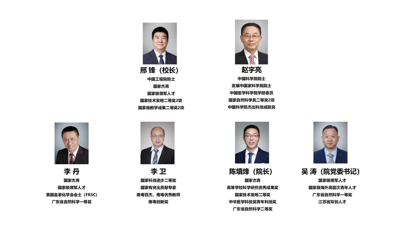 学院现有教职工159人,专任教师中拥有一大批优秀教学科研人才,其中包括中国工程院院士1人、中国科学院院士1人、国家杰出青年科学基金获得者2人、国家级领军人才1人、“南粤百杰”人才1人、国家级青年人才4人。