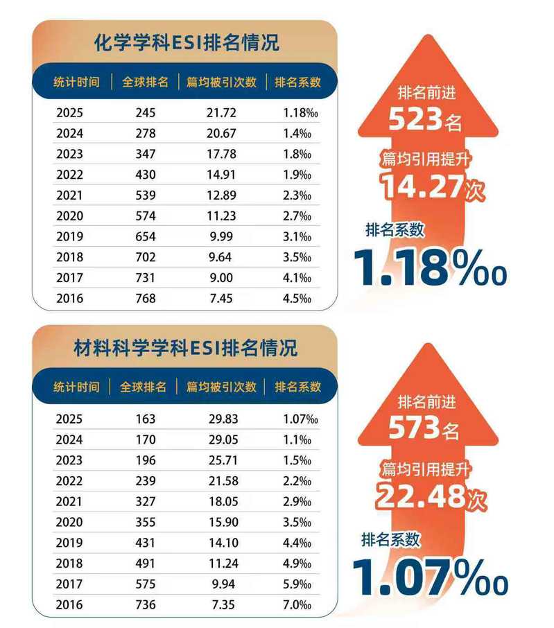化学、材料学两个学科分别于2012年、2016年进入ESI全球前1%行列,目前均在全球前2‰的排名以内,化学排名前1.18‰,材料科学1.07‰。截至2025年5月,化学学科ESI 全球排名为245位,材料科学学科ESI 全球排名为163位。在2024年公布的泰晤士高等教育中国学科评级中,化学及材料科学与工程得分均为A-,占我校A类学科的1/4。