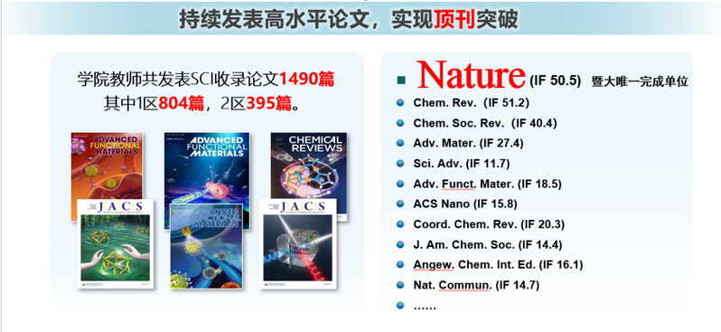 2016年成立至今,学院主持承担包括国家自然科学基金杰出青年基金、重大研究计划、重点项目、原创探索计划项目、国家重点研发计划、广东省杰出青年项目、广东省重大基础与应用基础研究项目等科研项目460项;在包括Nature, Chem, J Am Chem Soc,Adv Mater, Angew Chem和Nat Commun等国内外重要学术期刊发表论文超1000篇,专著20余本,授权专利232项,科研成果奖励31项,主持制修订国家标准10项、行业标准9项、团体标准14项。
