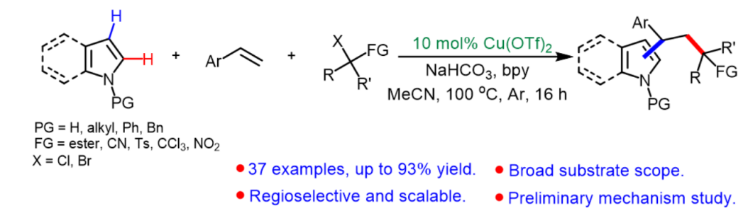该论文基于“氧化还原中性”策略,在廉价过渡金属铜催化下,从简单易得的烯烃、芳烃及卤代物出发,经三组分偶联反应直接得到1,1-二芳基烷烃化合物,该方法具有原料及催化剂廉价易得、合成效率高等优点,反应更加绿色、环保。该研究有助于高效构建1,1-二芳基烷烃类化合物库,为药化、生化相关研究提供合成方法学方面的技术支持。