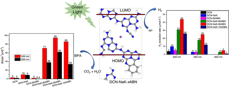 无金属共轭聚合物石墨氮化碳(g-C3N4)具有合适的带隙、较高的化学和热稳定性以及环保特性,被认为是一种很有应用潜力的光催化剂。然而,光生载流子的高重组率和较低的可见光响应(不超过460 nm)限制了其光催化活性和适用范围。为了改善g-C3N4材料的光催化性能,研究人员通过有机化学途径在CN网络框架中引入芳香族基序以及经过NaCl-KCl熔融盐处理提高了π电子的离域化程度。密度泛函理论计算显示DCN-NaK-xABN中C和N原子轨道态密度在各峰位置处高度重合,表明模型结构可以稳定存在。DCN-NaK-xABN中前线轨道波函数分布有明显区别,对比表明光生载流子的空间分离得到了显著改善,有利于电子在平面内的转移和光催化性能的提高。复合材料DCN-NaK-xABN在可见光照射下可以获得更多的光子,并可抑制光生载流子的复合,从而显著提高PHE和BPA的光降解效果。特别是,该复合材料在绿光区表现出很高的光催化活性。