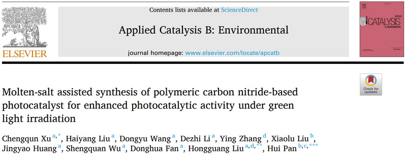 Chengqun Xu*, Haiyang Liu, Dongyu Wang, Dezhi Li, Ying Zhang, Xiaolu Liu, Jingyao Huang, Shengquan Wu, Donghua Fan, Hongguang Liu*, Hui Pan* Molten-salt assisted synthesis of polymeric carbon nitride-based photocatalyst for enhanced photocatalytic activity under green light irradiation. Applied Catalysis B: Environmental 334 (2023) 122835.