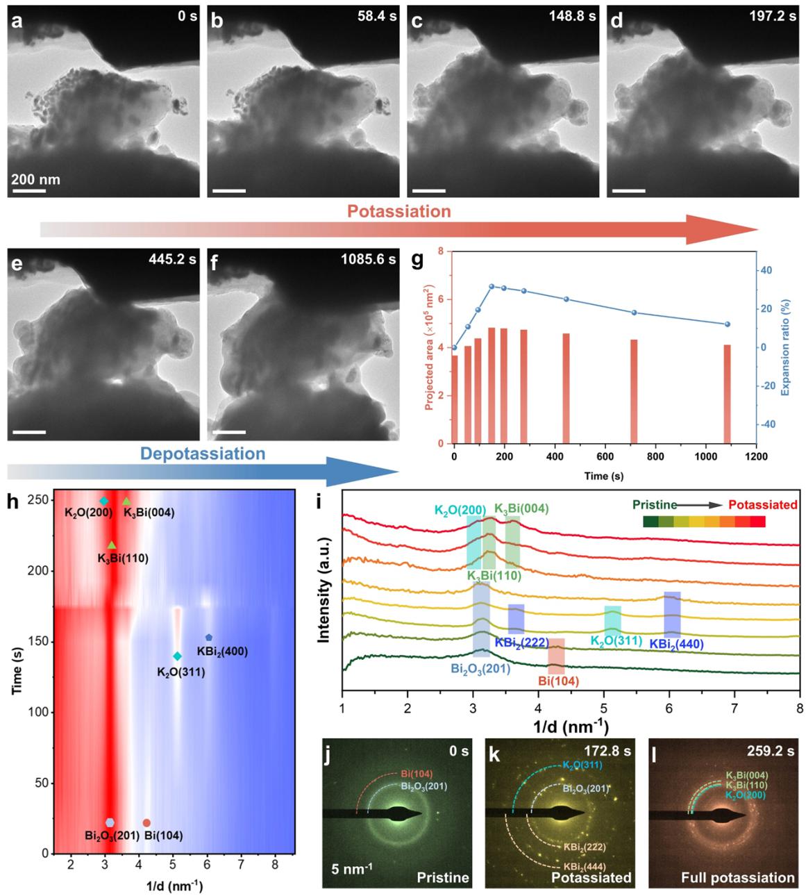 为了明晰电极材料在充放电过程中的微观结构演变,我们通过原位透射电镜和原位X射线衍射对Bi/Bi2O3 NDs@CSs材料进行实时监测。钾化过程中,钾离子开始进入Bi/Bi2O3 NDs@CSs,会产生明显的体积膨胀,随着钾离子的不断嵌入,材料逐渐发生转化和合金化反应并经历了体积变化,而外部碳片仍然紧紧地覆盖在K-Bi合金化产物的表面,并随着膨胀形状的变化而变化。而对于充电过程,钾离子逐渐从K-Bi合金中脱出,直至Bi和Bi2O3的重现,且Bi/Bi2O3 NDs@CSs的体积逐渐回缩,表明可逆的合金/脱合金化反应。