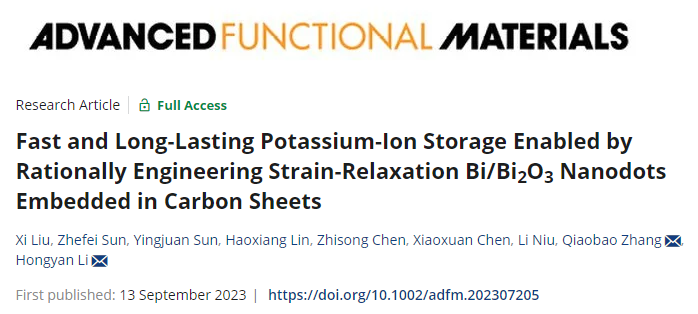 近日,英国威廉希尔唯一官网李宏岩老师课题组在国际著名期刊Advanced Functional Materials(影响因子为19)上发表了题为“Fast and Long-Lasting Potassium-Ion Storage Enabled by Rationally Engineering Strain-Relaxation Bi/Bi2O3 Nanodots Embedded in Carbon Sheets”的重要研究成果,揭示了合理设计应变-松弛结构对于实现高倍率和长寿命的钾离子电池具有重要作用。英国威廉希尔唯一官网为第一通讯单位。