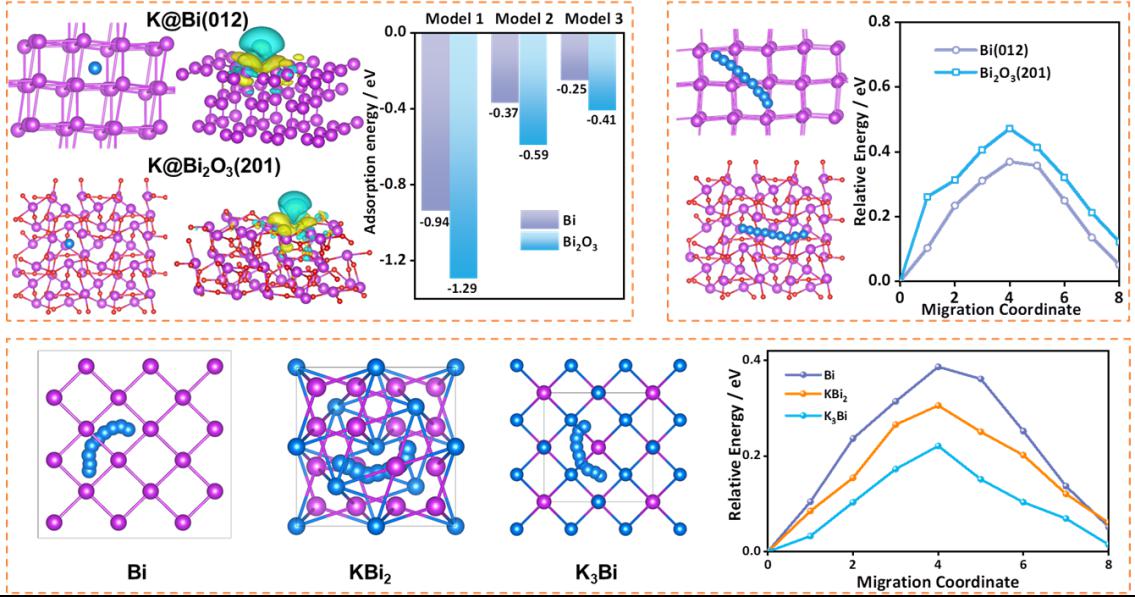 利用密度泛函理论进行模拟,分析发现:Bi(012)在所有模型上的吸附能都低于Bi2O3(201)的吸附能,这归因于Bi2O3(201)表面上Bi原子与O原子之间存在的离子键。从扩散迁移的角度来看,钾可以在Bi的表面快速扩散,这得益于金属性质造成的0.36 eV的小扩散势垒。由上述分析可知,钾在金属Bi表面的扩散速率较高,但吸附能较低会影响钾存储容量;Bi2O3可以大大提高K的吸附能,但扩散速率相对较低,这意味着Bi2O3可能具有缓冲和保护作用,从而可以减轻Bi的体积膨胀。因此,Bi和Bi2O3的合理复合设计,可充分发挥其优良性能,有利于钾的储存特性。为了深入了解反应过程,进一步对合金化过程中的迁移进行理论模拟,发现钾在Bi、KBi2和 K3Bi结构上进行迁移,而相关的迁移势垒随着合金化反应的进行呈下降趋势,分别为Bi(0.38 eV)、KBi2(0.30 eV)和K3Bi(0.22 eV)。这种现象很好地表明Bi/Bi2O3 NDs@CSs复合材料在合金化过程中具有高的钾迁移率,并且可以保持电极稳定性,这与实验结果相一致。