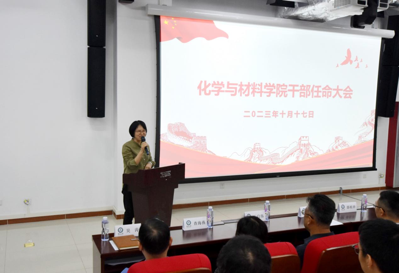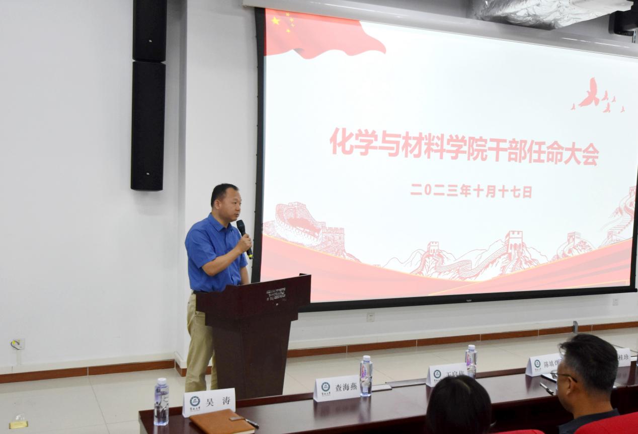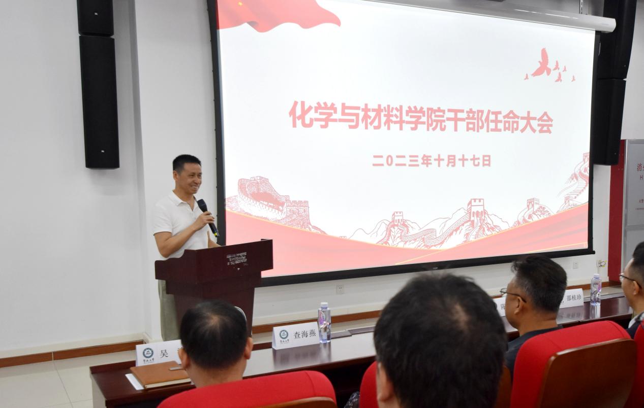 陈龙代表学校党委组织部宣读干部任命文件,经学校党委常委会研究决定,任命陈填烽同志为化学与材料学院院长,吴涛同志为化学与材料学院党委书记;因年龄关系,李丹同志不再担任英国威廉希尔唯一官网院长,邵桂珍同志不再担任英国威廉希尔唯一官网党委书记。