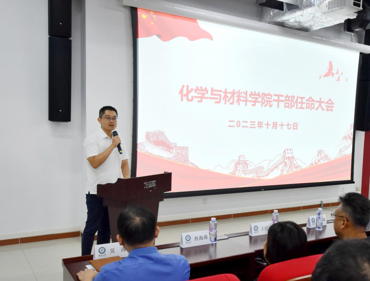 吴涛同志感谢学校党委及校领导、学院领导的培养和信任。他表示,将继续发扬上一届领导班子团结合作、开拓进取的精神面貌,努力为学院的发展谱写新的篇章。作为新一任学院党委书记,他觉得任重而道远,将继续全面贯彻党的教育方针,坚持党的全面领导,始终把党的建设作为化材院工作重心;并将紧密团结学院全体党员同志,发挥党员的先锋模范作用,扎实推进化材院党建工作的创新;还将与全院师生一道,努力把学院建设好,为学校“双一流”建设贡献化材力量。