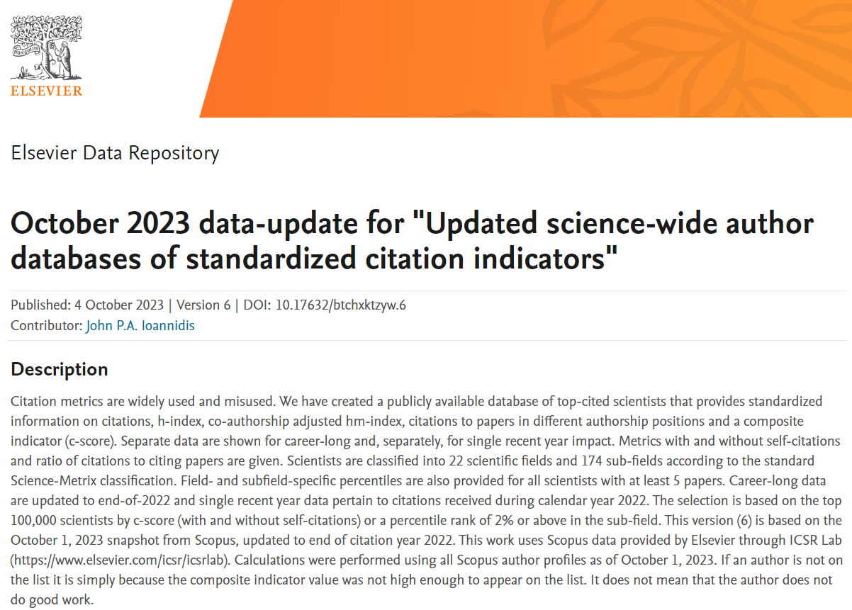 榜单来源:Ioannidis, John P.A. (2023), “October 2023 data-update for "Updated science-wide author databases of standardized citation indicators"”, Elsevier Data Repository, V6, DOI: 10.17632/btchxktzyw.6