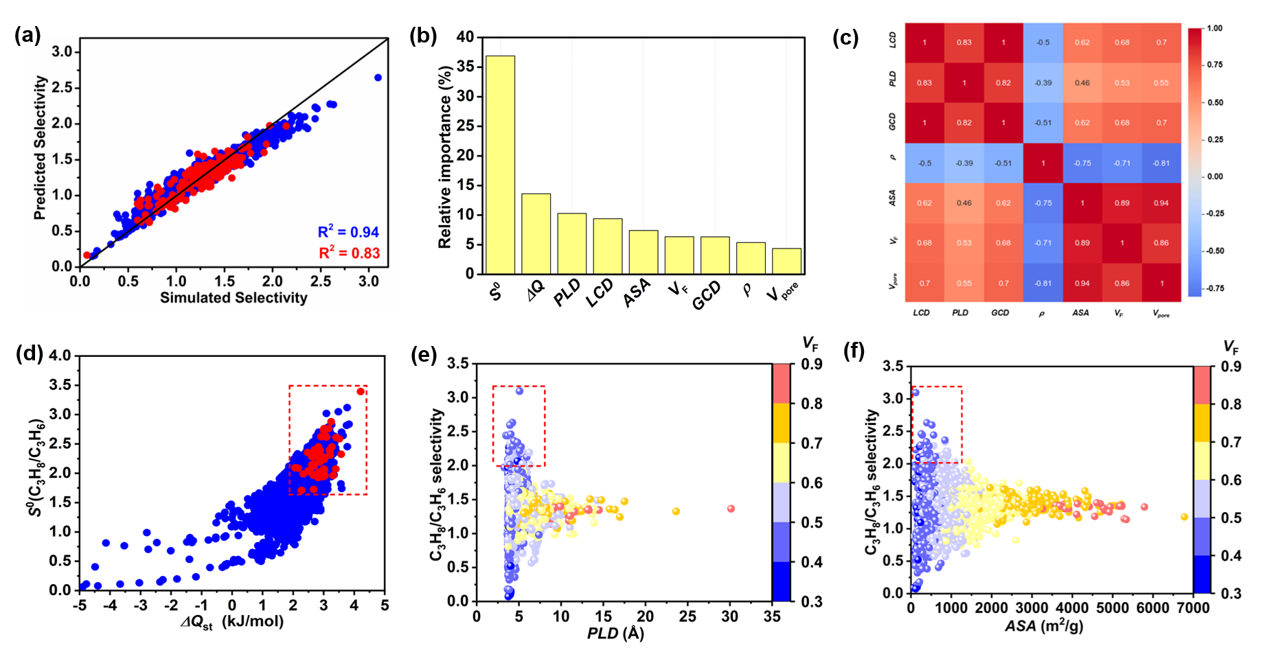图2. (a) 将随机森林算法对训练集(蓝色)和测试集(红色)预测的C3H8/C3H6选择性与巨正则系综蒙特卡洛(GCMC)模拟的结果进行比较。(b) 机器学习描述符的相对重要性。(c) 结构描述符的皮尔逊相关矩阵。(d) 吸附热差值与亨利系数比的关系图。(e, f) C3H8/C3H6选择性与孔径和比表面积的结构-性能关系。