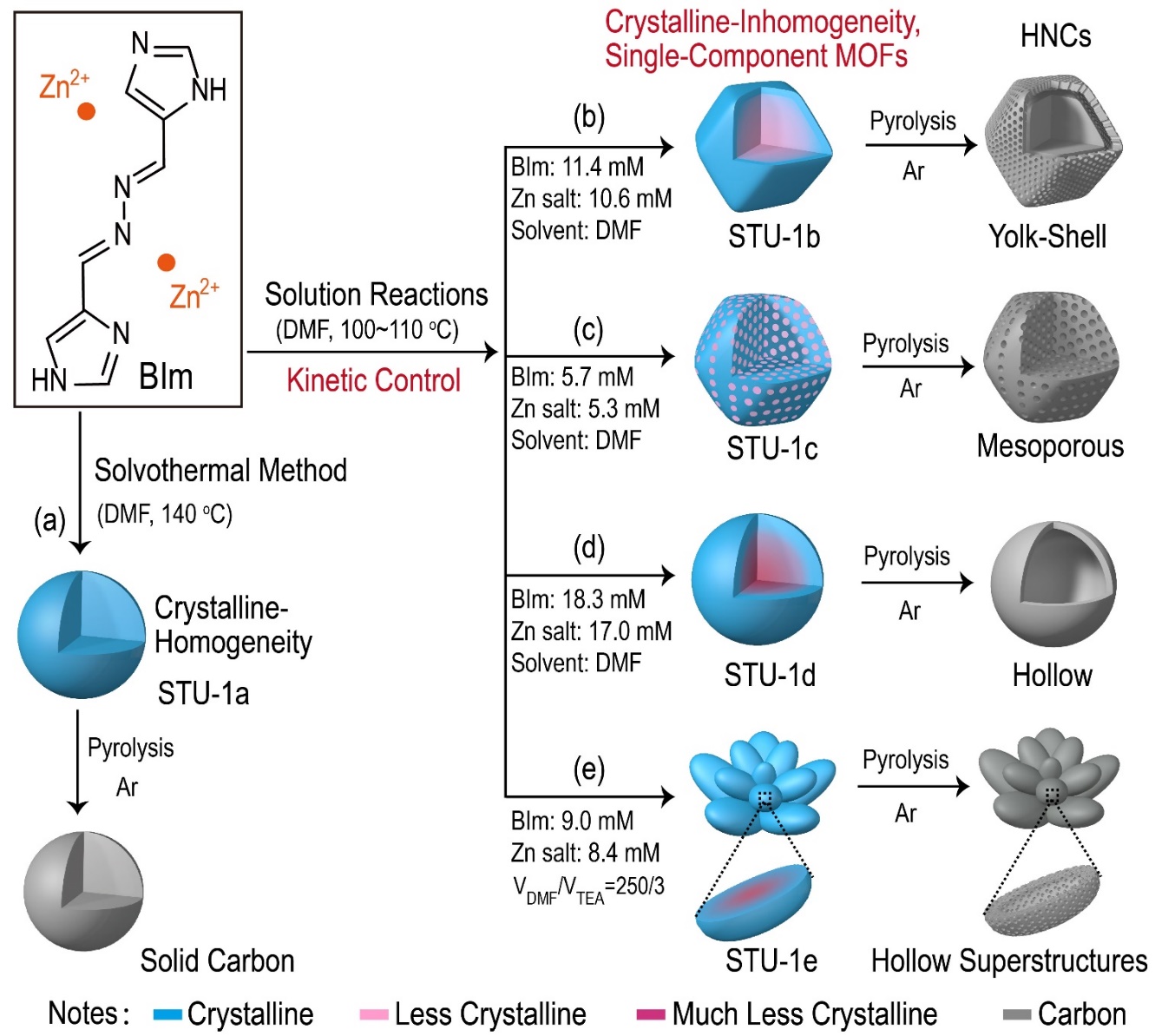 研究发现,以传统的溶液反应法代替溶剂热反应法,并结合反应动力学参数的控制,即可合成一系列不同颗粒结构(包括自组装结构)且内外结晶度分布不均的单一组分MOFs微米晶体颗粒(如图2所示)。这些结晶不均的MOFs颗粒经一步碳化即可分别演变形成不同结构的空心多孔碳材料,包括蛋黄-蛋壳多面体结构、介孔球结构、空心球结构以及空心多孔超结构。该方法成果避免了传统方法所需的包覆、刻蚀和配体交换等苛刻步骤,具有较强的调控性和放大制备可行性。