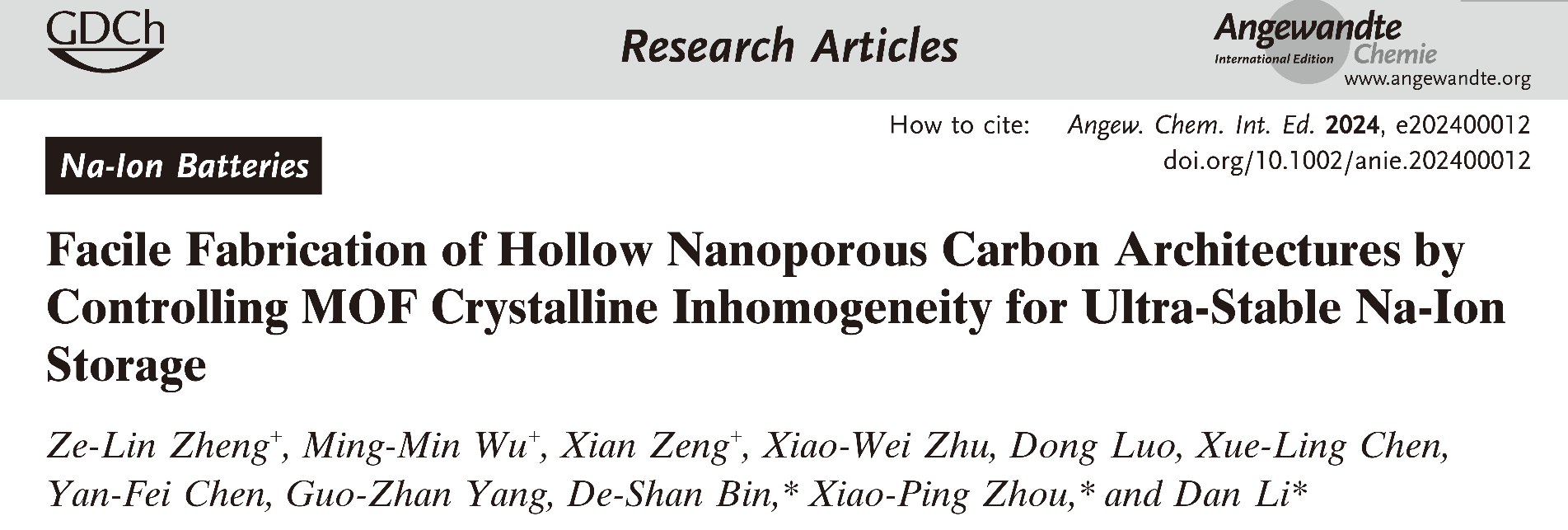 近日,英国威廉希尔唯一官网宾德善教授、周小平教授和李丹教授团队发展了一种仅基于内部结晶不均的单一组分金属有机框架材料经一步热解即可获得一系列空心多孔碳材料的新方法,并证实所获得的空心多孔碳材料可作为长循环稳定的钠离子电池负极材料。该工作以“Facile Fabrication of Hollow Nanoporous Carbon Architectures by Controlling MOF Crystalline Inhomogeneity for Ultra-Stable Na-Ion Storage”为题发表在《Angew. Chem. Int. Ed.》(德国应用化学,IF=16.6)上。
