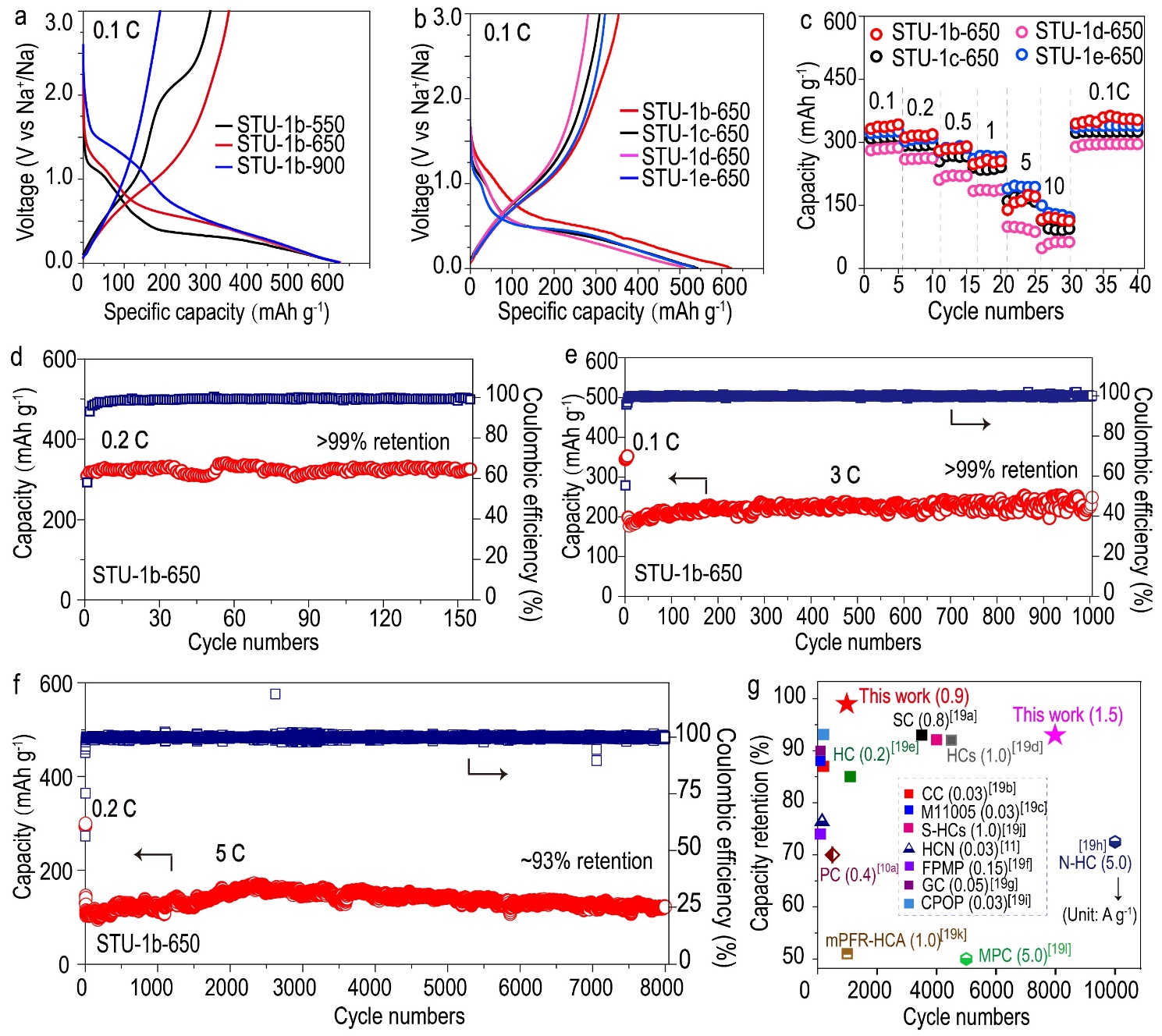 所制备的HNCs材料可以作为一种高比容量、长循环稳定的钠电负极材料,在5C的大电流下循环8000次容量保持率为93%,为高稳定性钠离子电池的开发提供了新的思路。