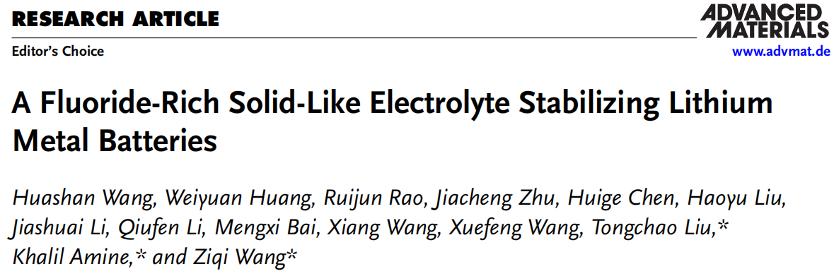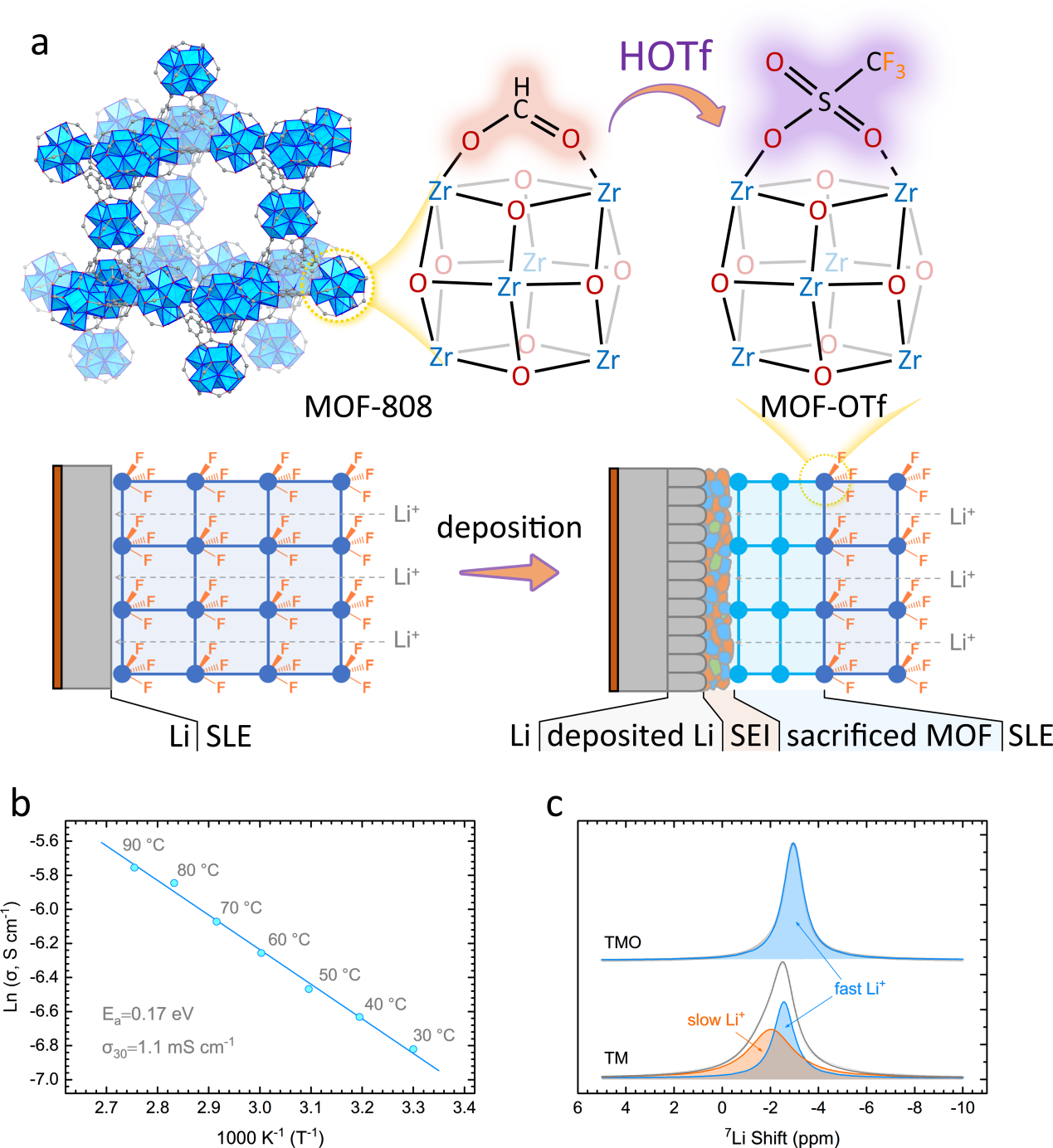 锂金属因具有高的能量密度和低的电极电势被认为是二次电池负极的“圣杯”材料。然而,较低的库伦效率和枝晶生长等问题一直制约着锂金属负极的实际应用。要解决这些科学问题,构筑稳定、均匀的固态电解质界面(SEI)是一条有效途径。近日,威廉希尔官网教师王子奇与阿贡实验室合作,以“A Fluoride-Rich Solid-Like Electrolyte Stabilizing Lithium Metal Batteries”为题发表了一篇研究性文章,收录在材料领域期刊Advanced Materials上。威廉希尔官网研究生王华山为该文章第一作者。该研究报道了一种基于氟磺酸酸化的金属-有机框架材料的类固态电解质TMO,其不仅具有较高的室温离子电导率,更能促进均匀、致密且以无机成分为主的锂负极SEI生成。TMO的使用可有效提升锂金属电池的循环稳定性与安全性。