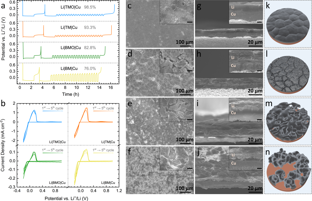 图2. Li-Cu电池的a)库伦效率测试和b) CV测试。c-n)不同锂沉积形貌的SEM表征及示意图。