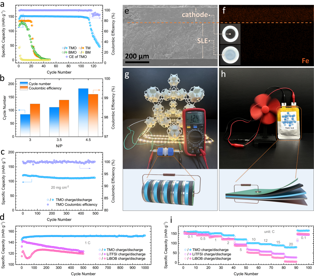 图4. 不同N/P比电池的a) 循环性能及b) 负极库伦效率。c) 高负载量电池的循环性能。d, i) 与液态电池循环性能的比较。e, f) 高负载量电池的截面SEM形貌。g, h) 高电压串联电芯和高容量软包电芯照片。