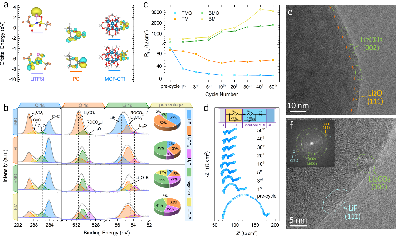 图3. a) TMO电解质的能级计算。b) SEI的XPS表征。c, d) 对称电池的界面阻抗演变。e, f) SEI的冷冻电镜表征。