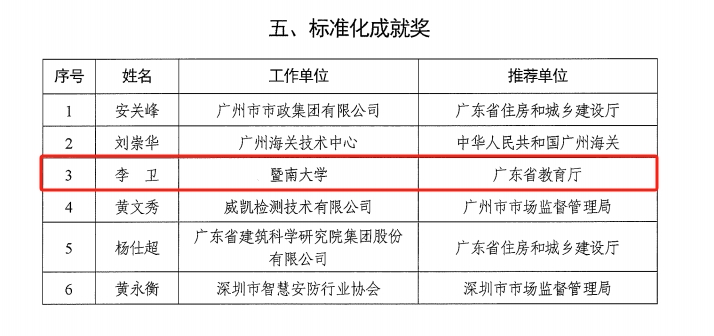 据悉此次广东省标准化突出贡献奖是广东省人社厅与省市监局联合首次设立,广东省标准化突出贡献奖标准化成就奖共计6名获奖人,李卫教授是唯一来自高校的获奖者。