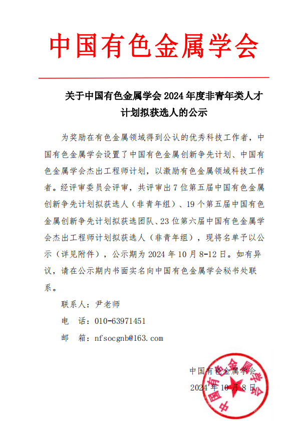 2024年10月,中国有色金属学会发布了《关于中国有色金属学会2024年度非青年类人才计划拟获选人的公示》,为奖励在有色金属领域得到公认的优秀科技工作者,中国有色金属学会设置了中国有色金属创新争先计划、中国有色金属学会杰出工程师计划,以激励有色金属领域科技工作者。经评审委员会评审,英国威廉希尔唯一官网王启伟研究员获批中国有色金属学会2024年度创新争先人才计划。