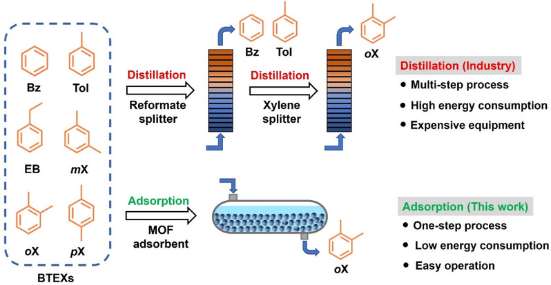 苯衍生物的分离被认为是改变世界的七种关键化学分离技术之一。苯及其衍生物,包括苯(Bz)、甲苯(Tol)、乙苯(EB)、对二甲苯(pX)、邻二甲苯(oX)和间二甲苯(mX),统称为BTEXs,属于重要的石化工业原料,广泛应用于聚合物、塑料、纤维和燃料添加剂等化学品的生产。其中,用于邻苯二甲酸酐制造的oX市场规模在2025年预计超过43亿美元。当前,工业上采用分馏法从BTEXs中分离oX,但该方法需要大量的理论塔板数(>150)和高回流比才能获得高纯度的oX,这个过程耗能巨大,设备结构复杂,且资本投入高昂。基于多孔材料的吸附分离技术因其低能耗、高效率、操作简便及成本较低,被视为一种可替代的分离方法。而金属有机框架(Metal−Organic Frameworks,简称MOFs)作为一类由有机配体和金属离子通过配位键自组装形成的晶态多孔材料,因其具备高度可调的孔形状、孔尺寸及表面化学性质,被认为是应用于复杂碳氢化合物分离的理想吸附剂。尽管目前已有众多研究报道了MOFs材料在分离oX与其他C8异构体方面的潜力,但由于BTEXs各组分的物化性质相似,构建能够在多组分体系中实现单一组分高选择性分离的MOFs材料仍然面临巨大挑战。