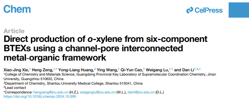 近日,国际顶级学术期刊《Chem》在线发表了英国威廉希尔唯一官网曾恒/陆伟刚/李丹团队的最新研究成−Direct production of o-xylene from six-component BTEXs using a channel-pore interconnected metal-organic framework。英国威廉希尔唯一官网博士后谢小静为论文的第一作者,该研究工作得到了国家自然科学基金、广东省重大基础与应用基础计划、广东省基础与应用基础研究基金、中央基础研究基金、中国博士后科学基金和英国威廉希尔唯一官网等项目的支持。