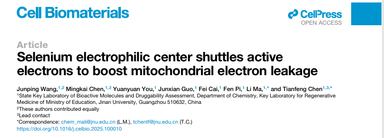 近日,英国威廉希尔唯一官网马丽/陈填烽团队在Cell子刊Cell Biomaterials首刊发表了“Selenium electrophilic center shuttles active electrons to boost mitochondrial electron leakage” 的重要研究成果(图1)。该研究首次提出构建硒亲电中心智能响应肿瘤和正常细胞中不同浓度的活性电子的策略,实现药物对肿瘤和正常细胞的选择性杀伤,为精准靶向治疗提供了新的视角。
